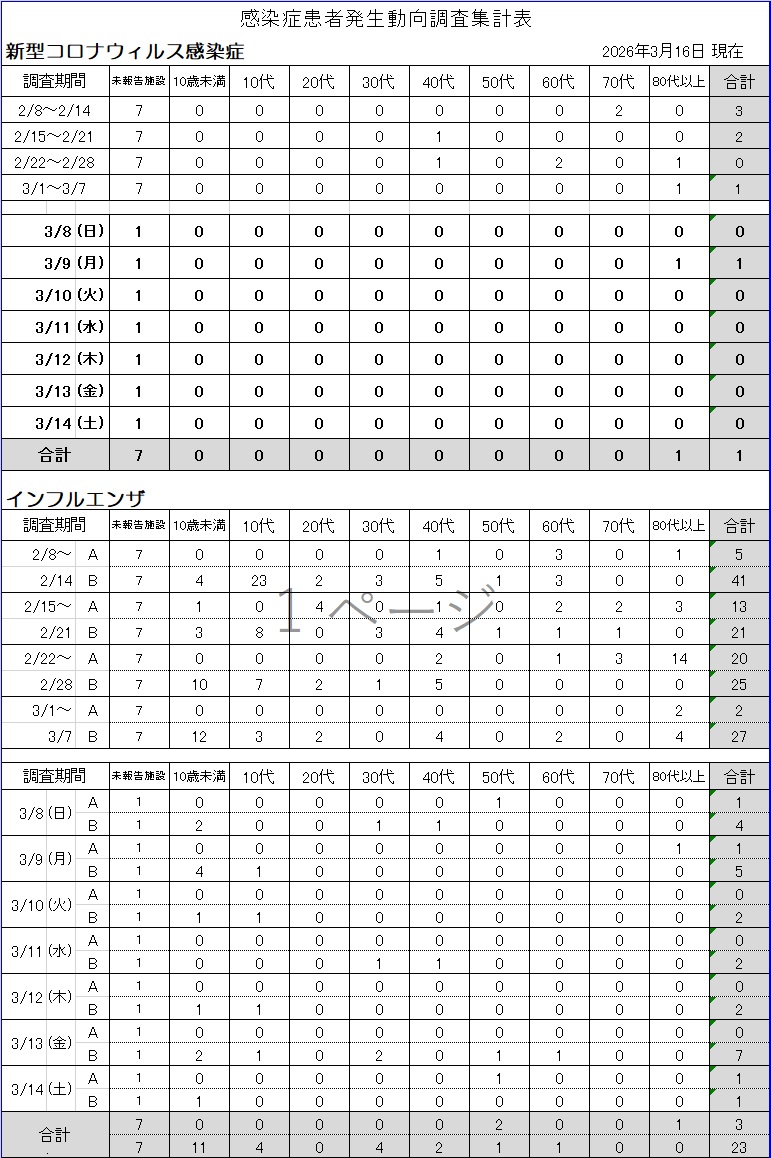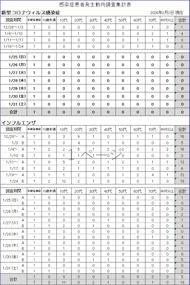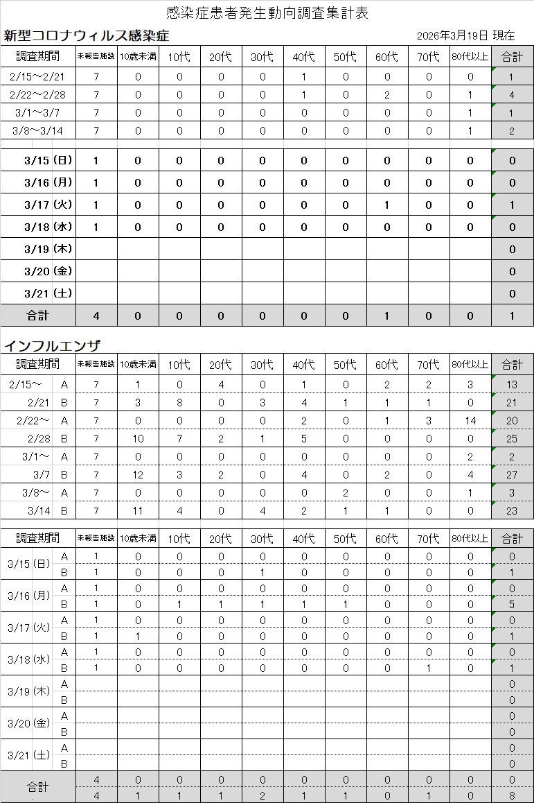 津久見市内 感染症患者発生動向調査(新型コロナウイルス感染症、インフルエンザ)